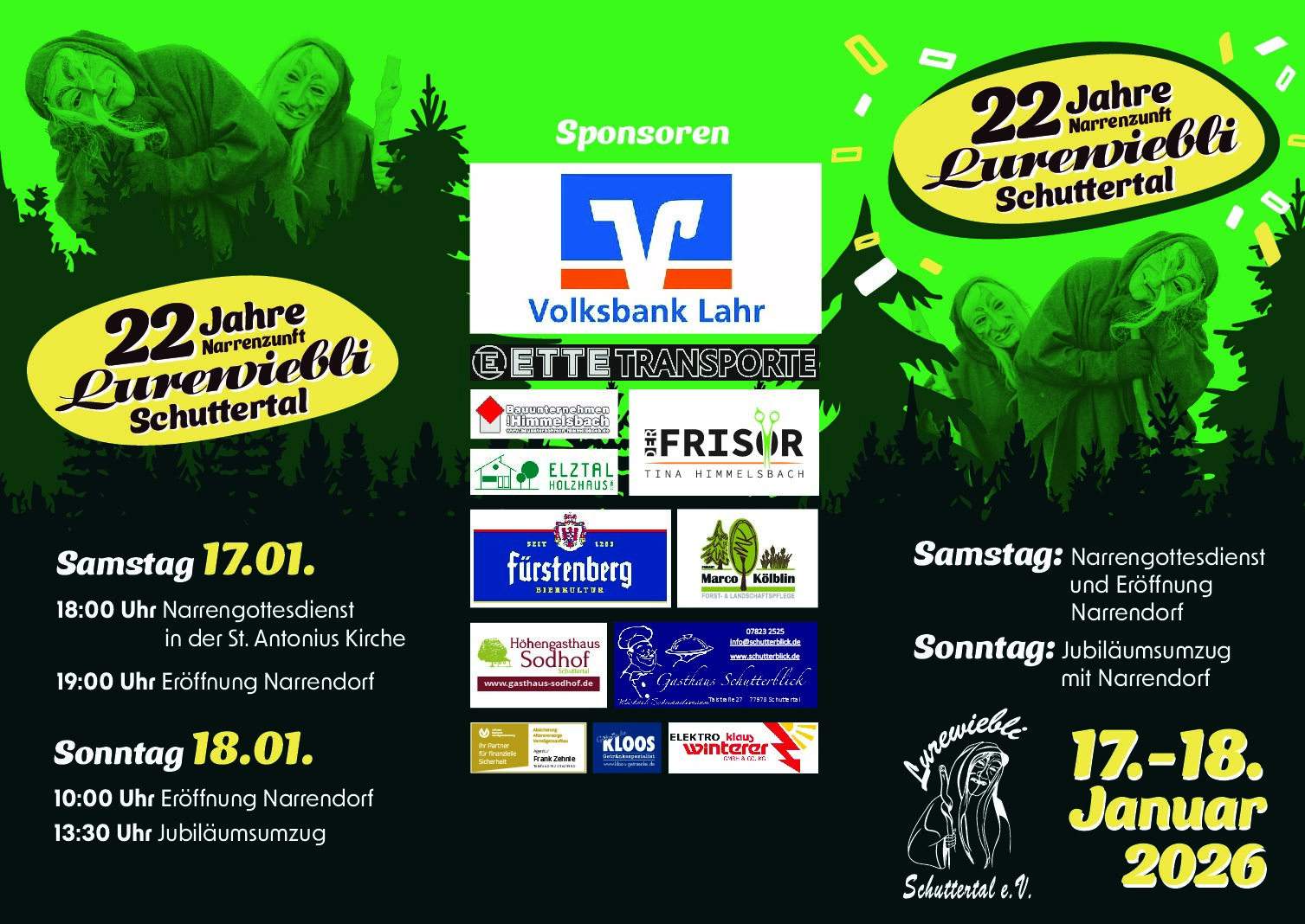 Los geht’s am Samstagabend mit einem Narrengottesdienst. Anschließend wird das Narrendorf rund um die Festhalle eröffnet. Mit einer großen Party wollen wir gemeinsam das 22jährige der Lurewiebli feiern. Am Sonntag wartet als Highlight der große Narrenumzug mit 68 Zünften und buntes Treiben durch den Ort auf Euch