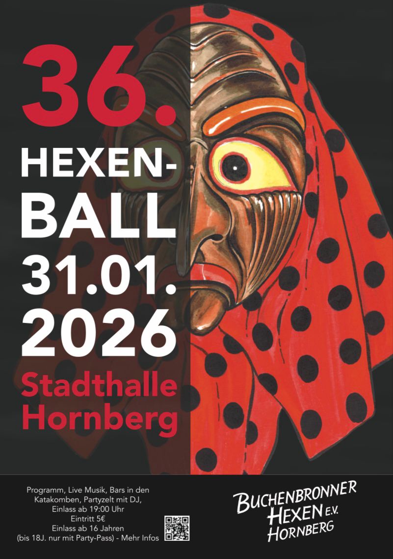 Wir freuen uns Euch 2026 bei unserem traditionellen Hexenball zu begrüßen. Freut Euch auf ein abwechslungsreiches Programm und Live-Musik in der Stadthalle. Auch die Bars in den Katakomben sind für Euch geöffnet.. Aber nicht nur das. Auf dem Stadthallenvorplatz erwartet Euch ein großes Partyzelt. Auch in der Hexenküche brodelt es, so dass auf hungrige Hästräger, Guggenmusiker und Fasnachtsfreunde eine große Auswahl an Speisen wartet.