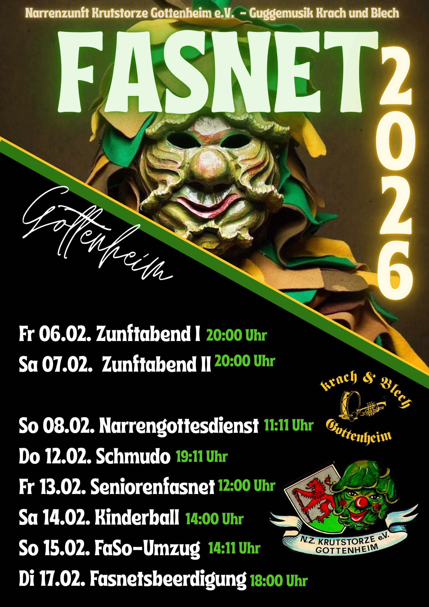 Die Narrenzunft Krutstorze Gottenheim e.V. lädt am 15.02.2026, um 14.11 Uhr zum traditionellen Fasnetsundigumzug ein.