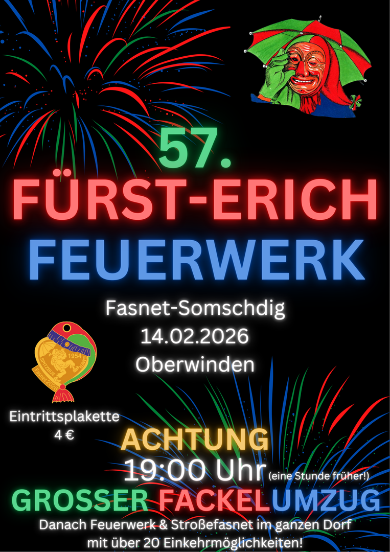 Am Samstag, 14. Februar 2026, findet in Oberwinden das 57. Fürst-Erich-Feuerwerk im Rahmen statt.