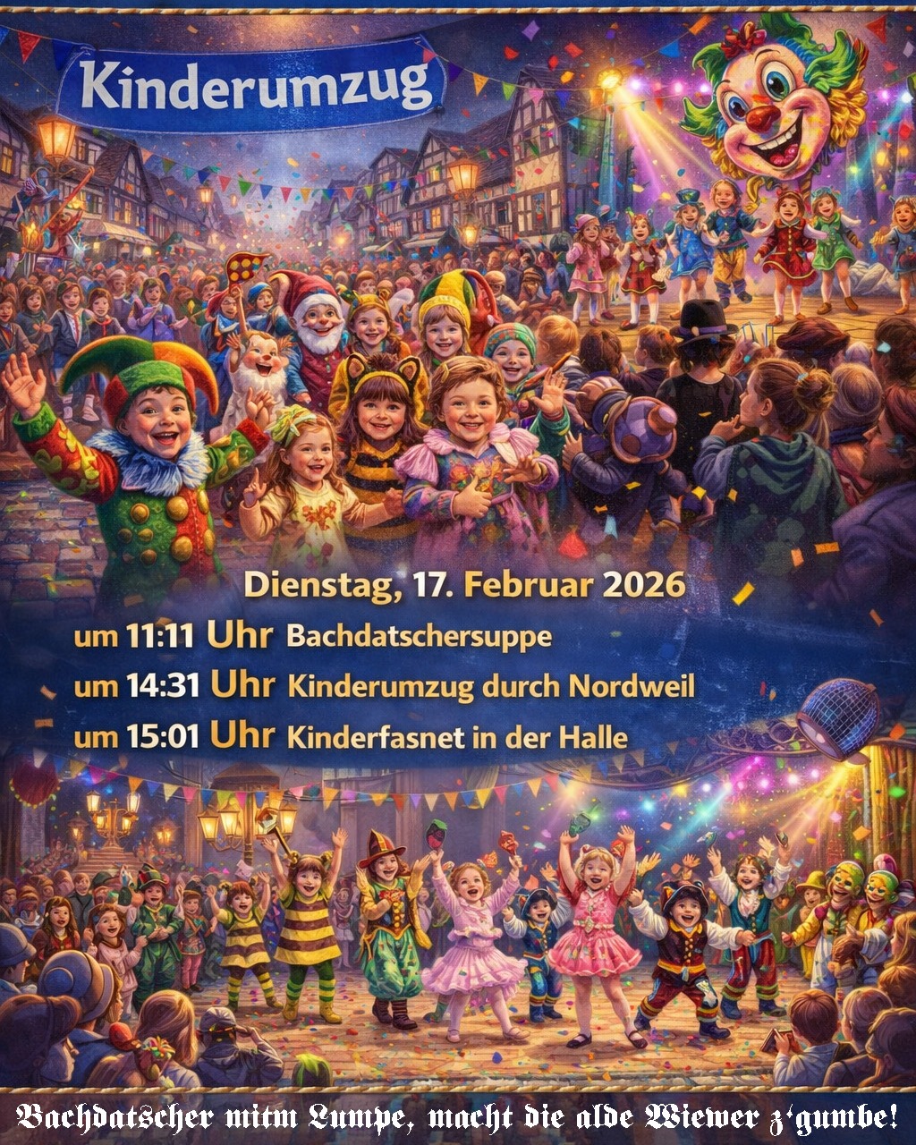 Der Fasnetstsischdig 2026 in Nordweil ist der Tag der Kinder und Familien. Ob Jungmusik, Bachdatschersuppe, Kinderumzug oder Kinderfasnet – hier zeigt sich, wie lebendig und herzlich die Fasnet von morgen ist. Vorbeikommen lohnt sich!