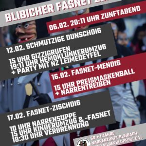Rosenmontagsumzug mit anschließender Prämierung der Mottogruppen und Narrentreiben in der Festhalle Bleibach.
